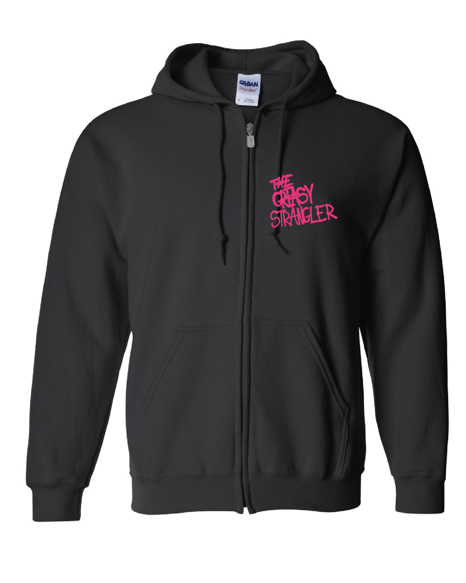 Stay cozy while repping one of the most outrageous films of all time! This black zip-up hoodie celebrates The Greasy Strangler with bold hot-pink lettering and iconic quotes that fans can't resist shouting.