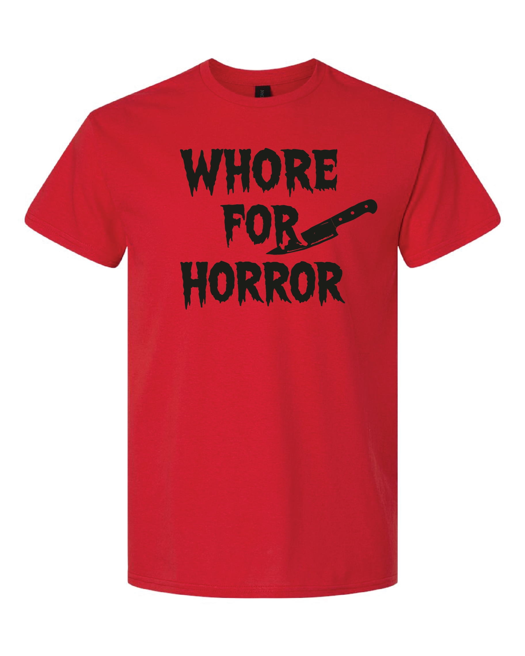 Show your love for slashers, gore, and everything spooky with this bold "Whore for Horror" tee. Perfect for horror fans who aren't afraid too wear their obsession loud and proud, this shirt is a killer conversation starter at conventions, screenings, and haunted hangouts.